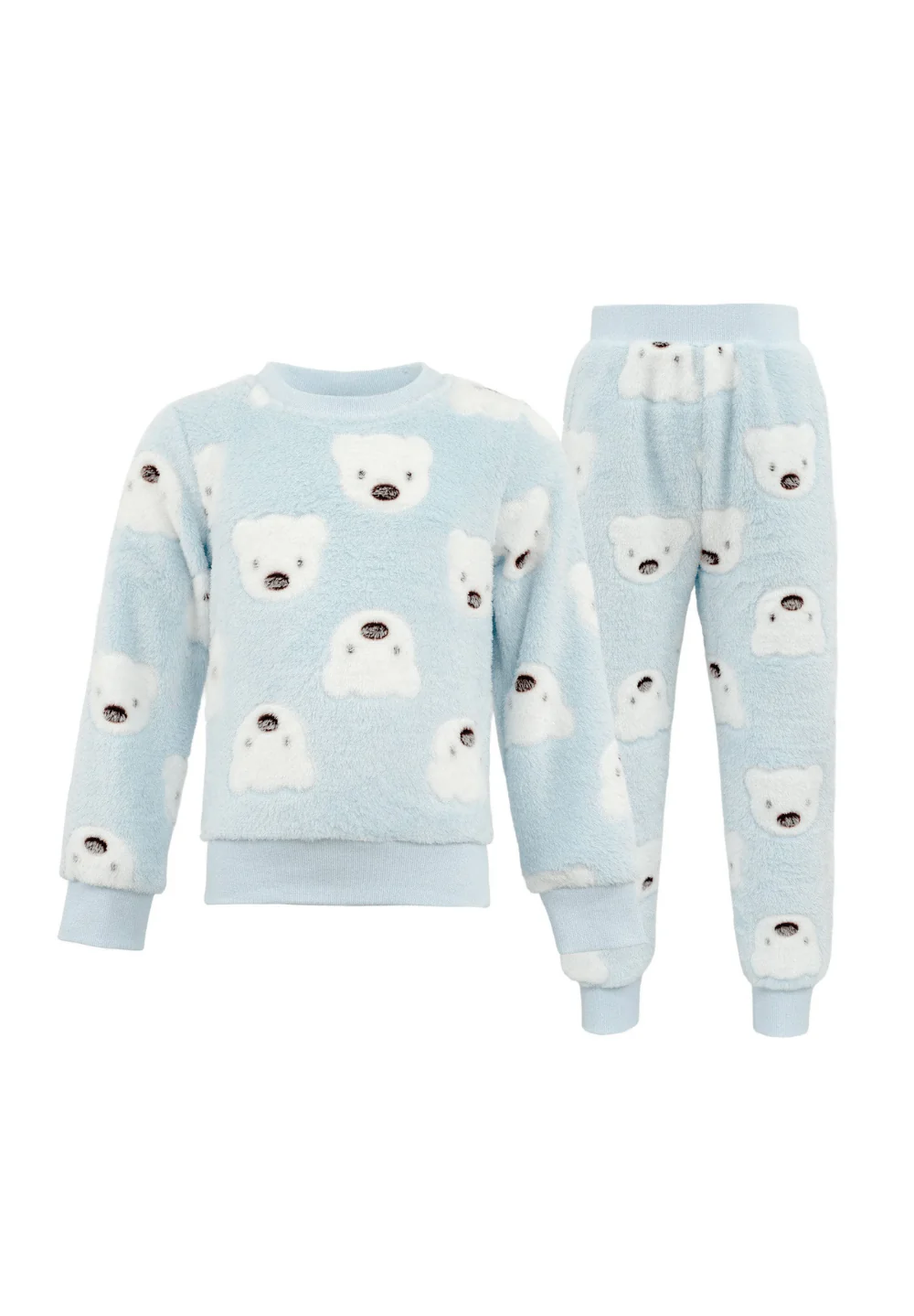 - Ultra-soft fuzzy pajama set in a soothing baby blue hue.
