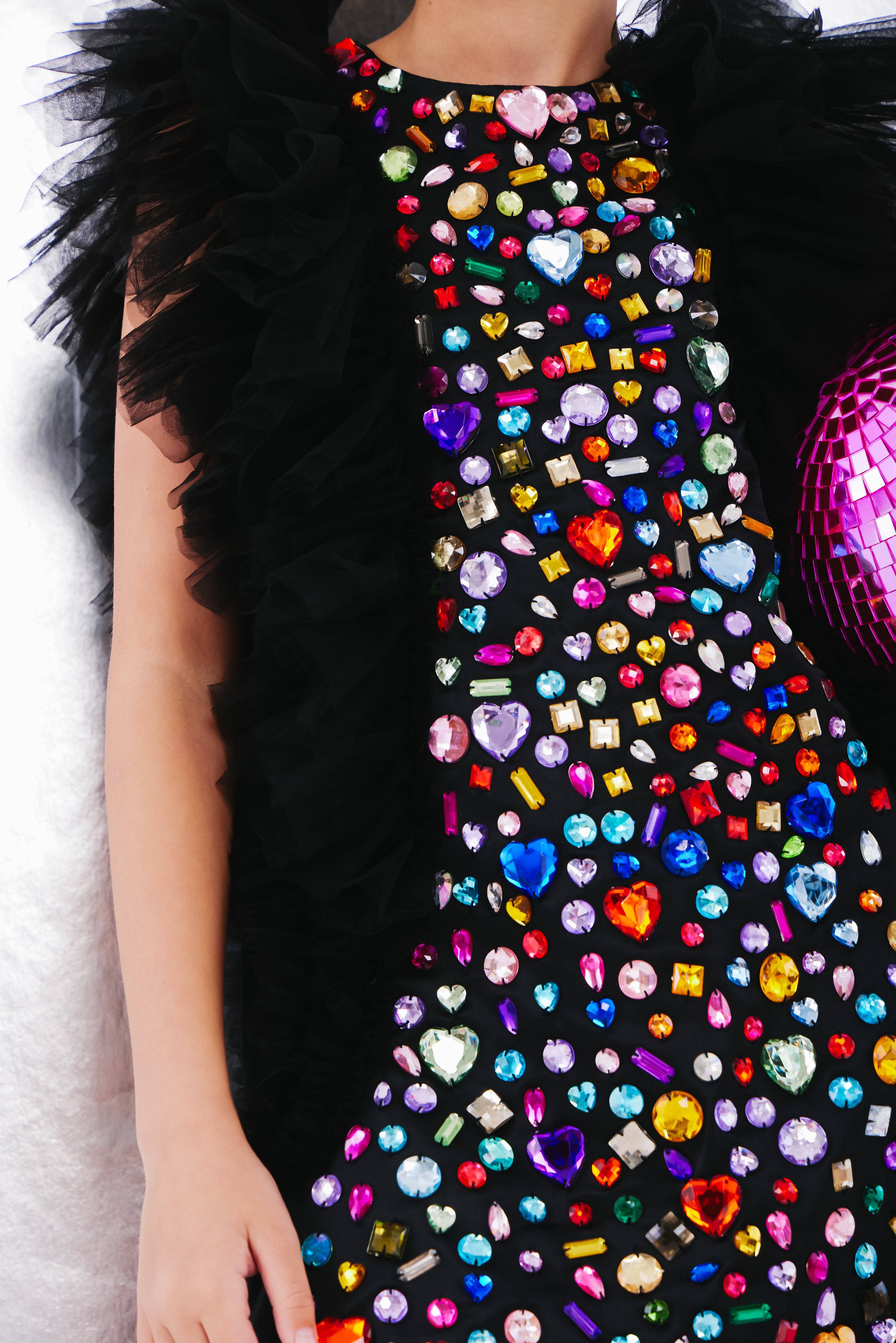 - Elegant black dress adorned with a vibrant array of multicolored gems for a striking, eye-catching look.