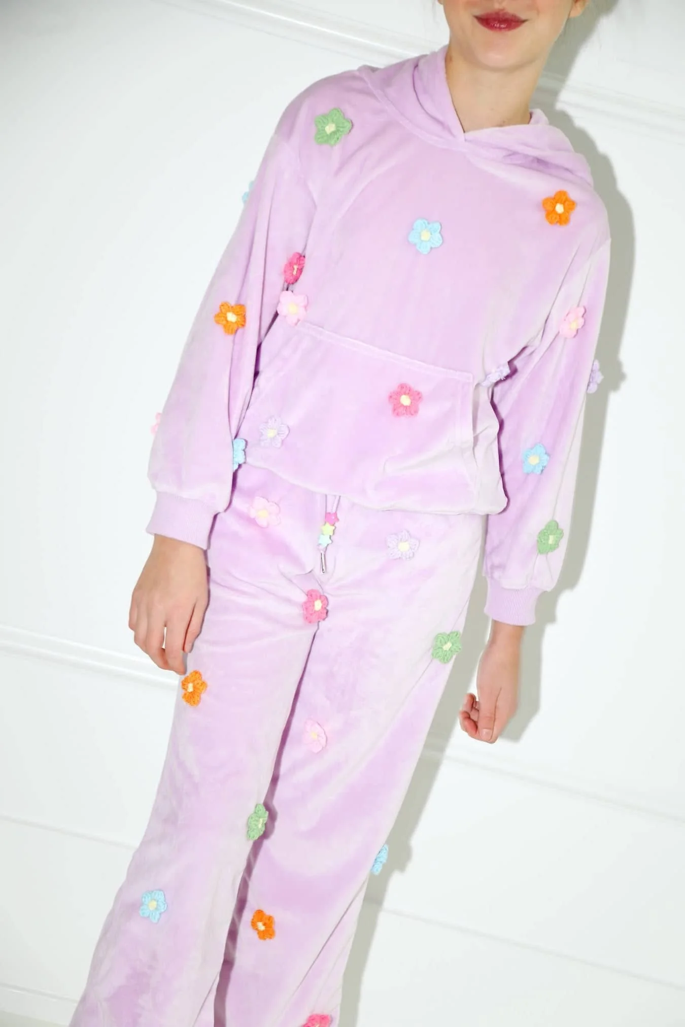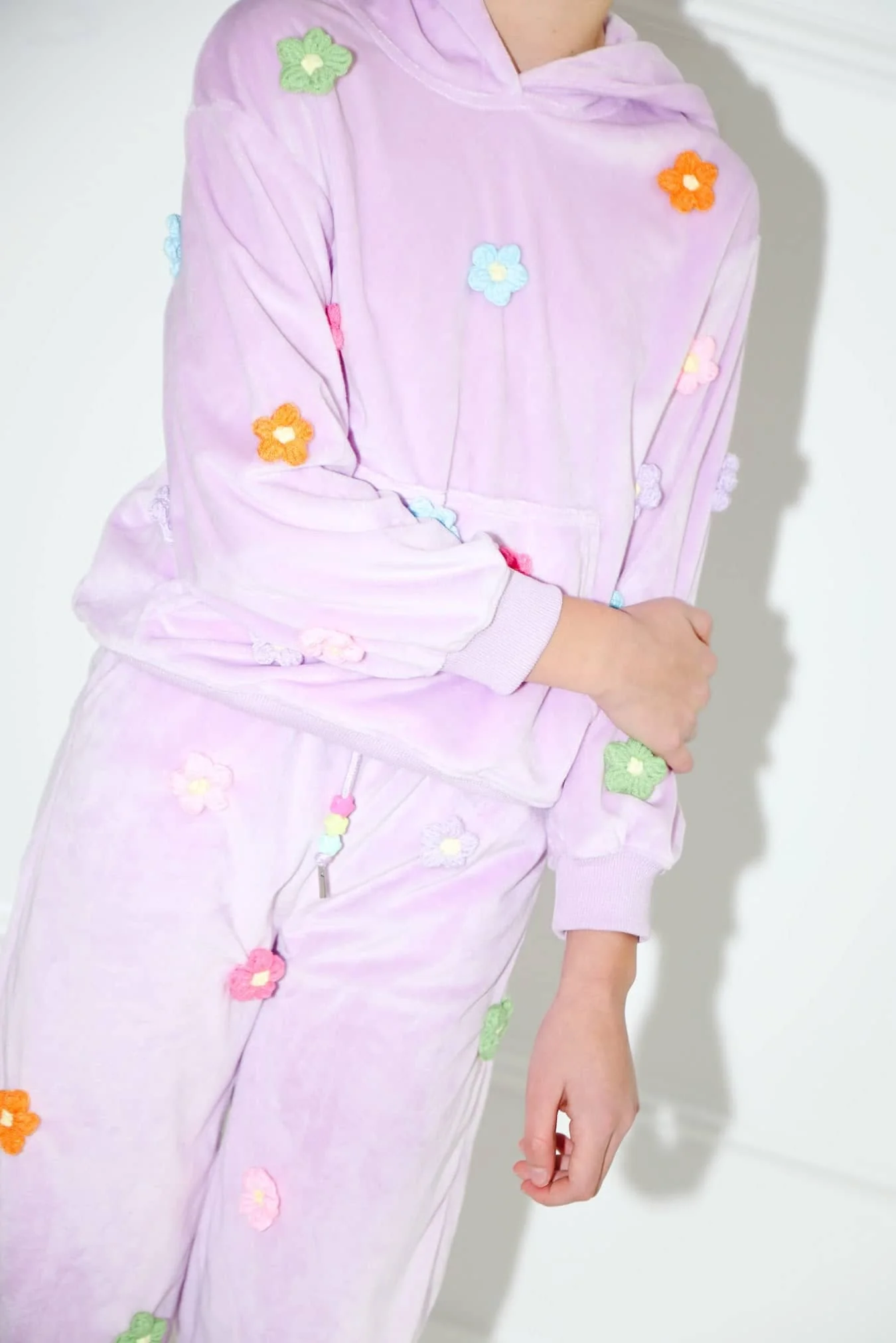 - Plush velour fabric (80% cotton, 20% polyester) with hand-stitched crochet flower appliqués