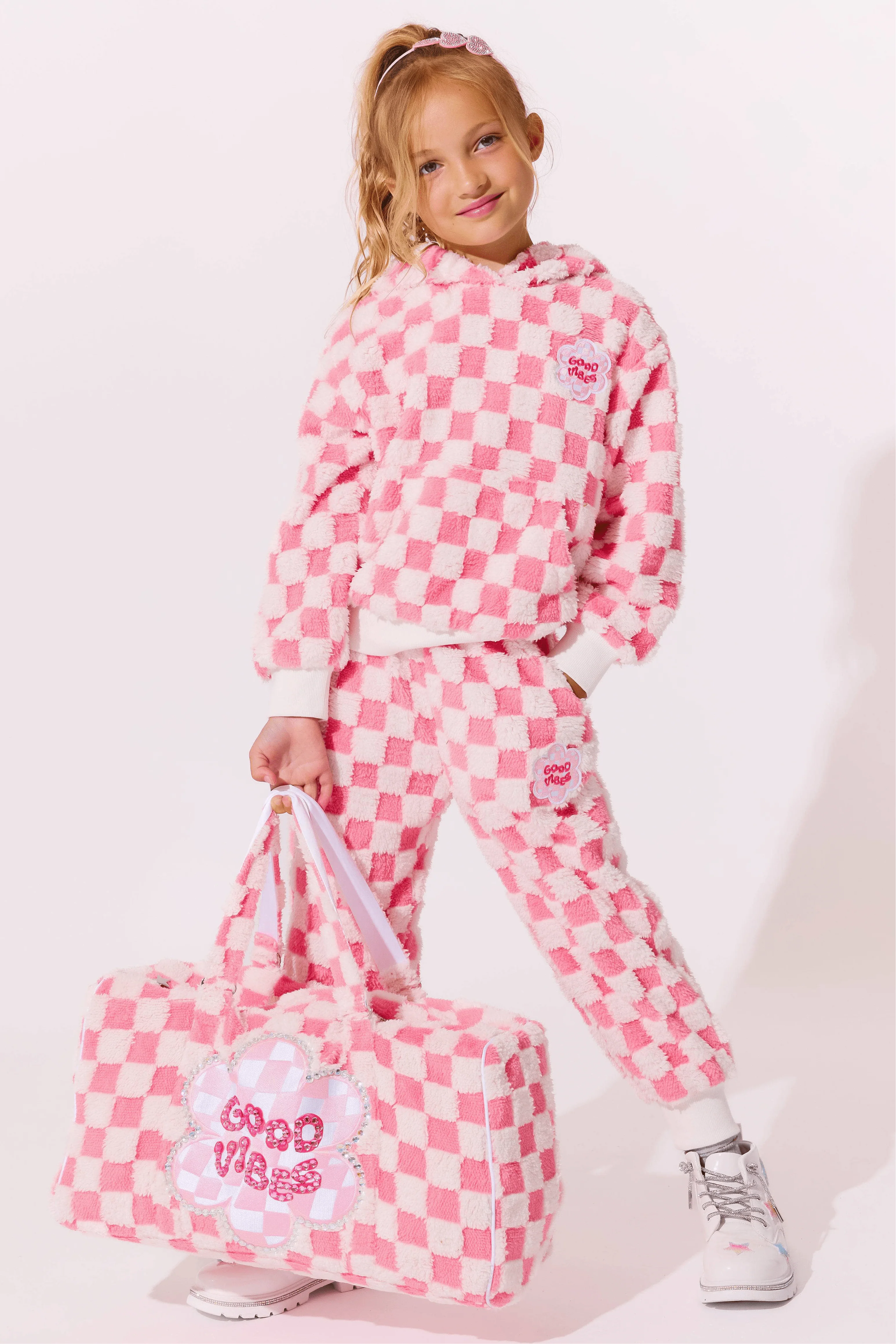 - Radiate positivity with this vibrant pink-and-white checkered plush set, featuring an eye-catching "Good Vibes" crystal-embellished back design.