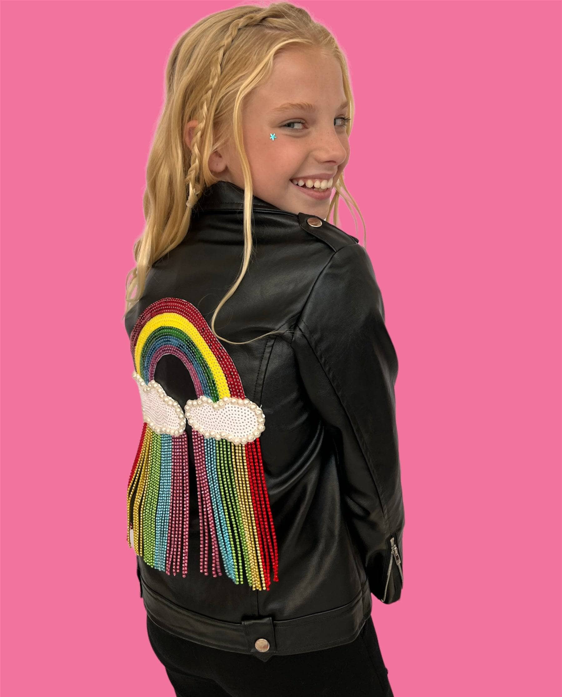 - Statement vegan leather jacket featuring a bold rainbow and crystal cloud design on the back.