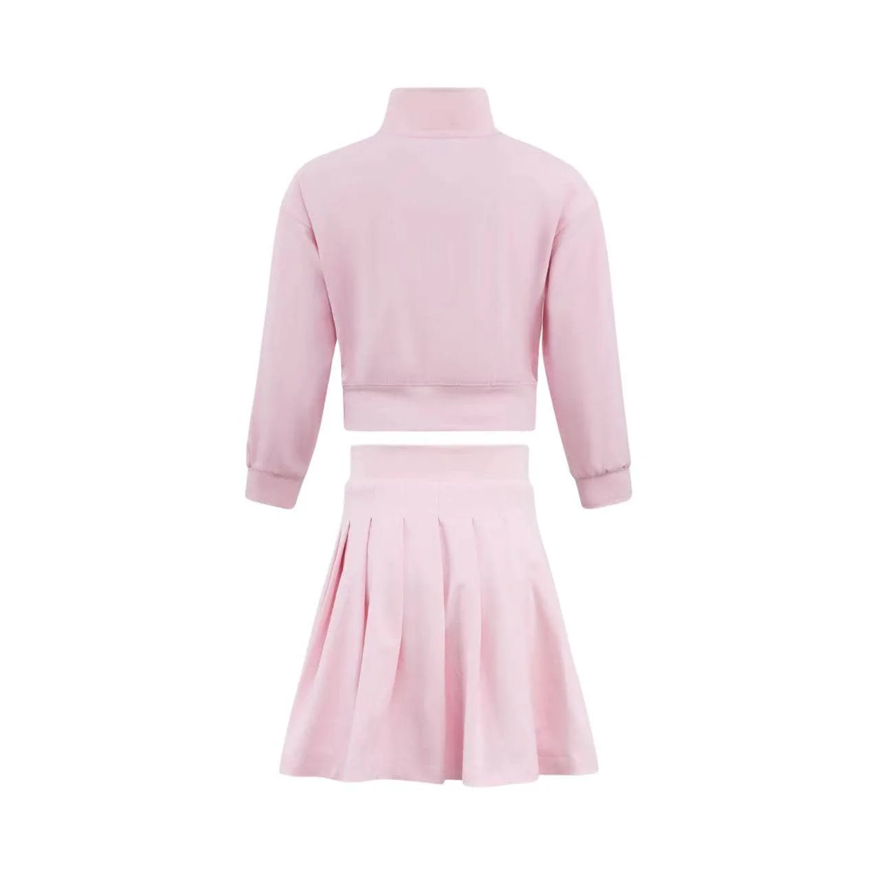 - Light pink athletic skort set featuring a long sleeve crop top with snap-button collar.