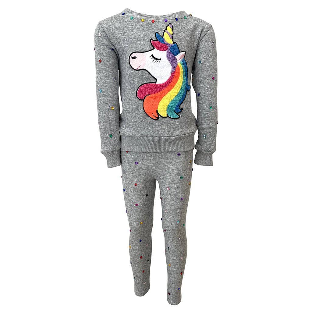 - Whimsical and comfy two-piece set featuring a rainbow unicorn sweatshirt and gem-studded leggings.