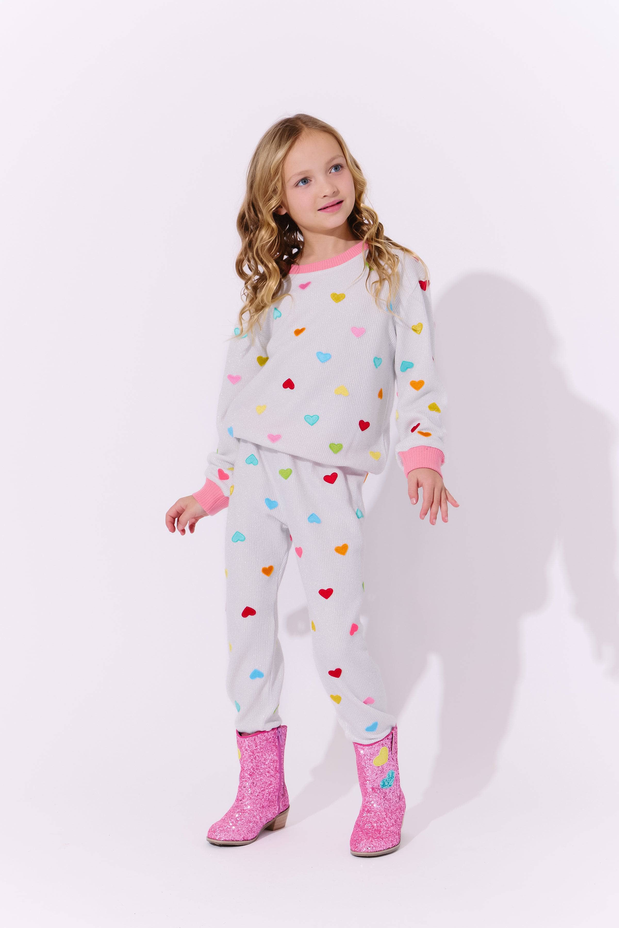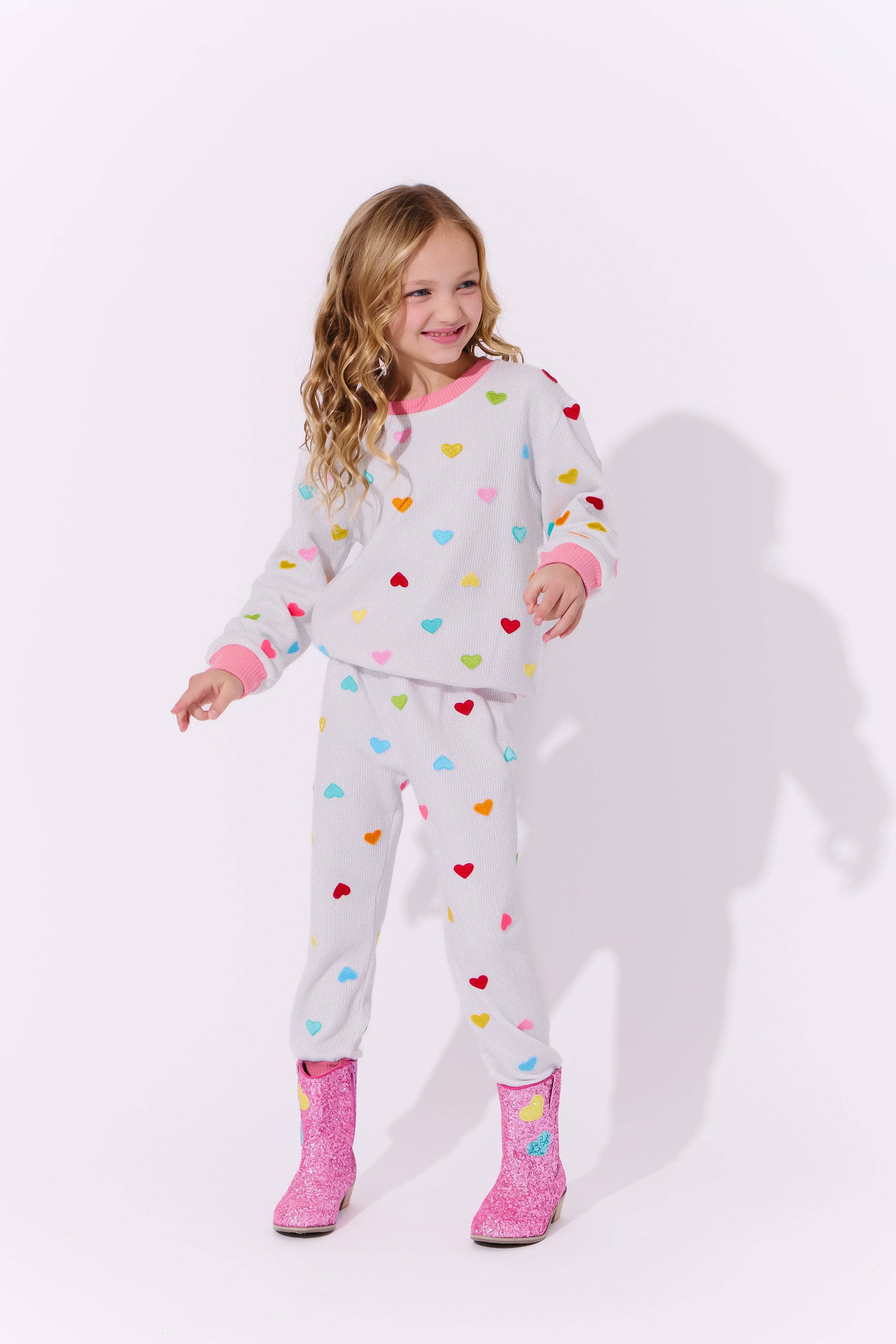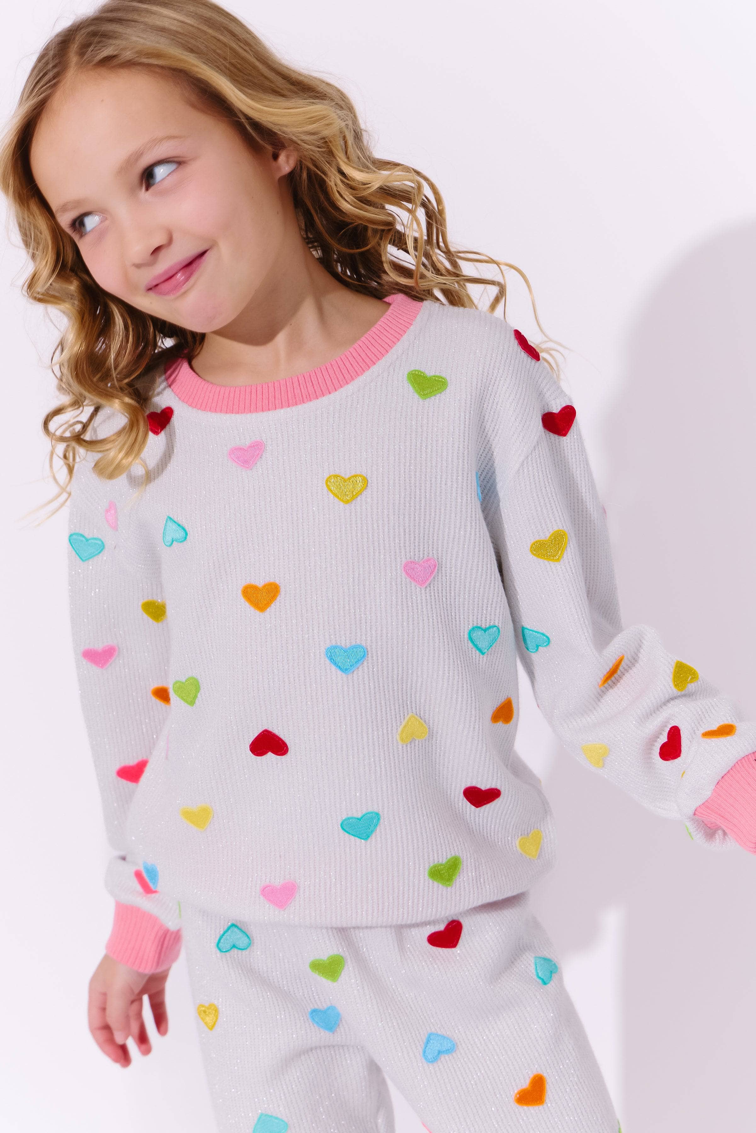 - Features a white ribbed knit fabric adorned with colorful embroidered hearts in rainbow shades.