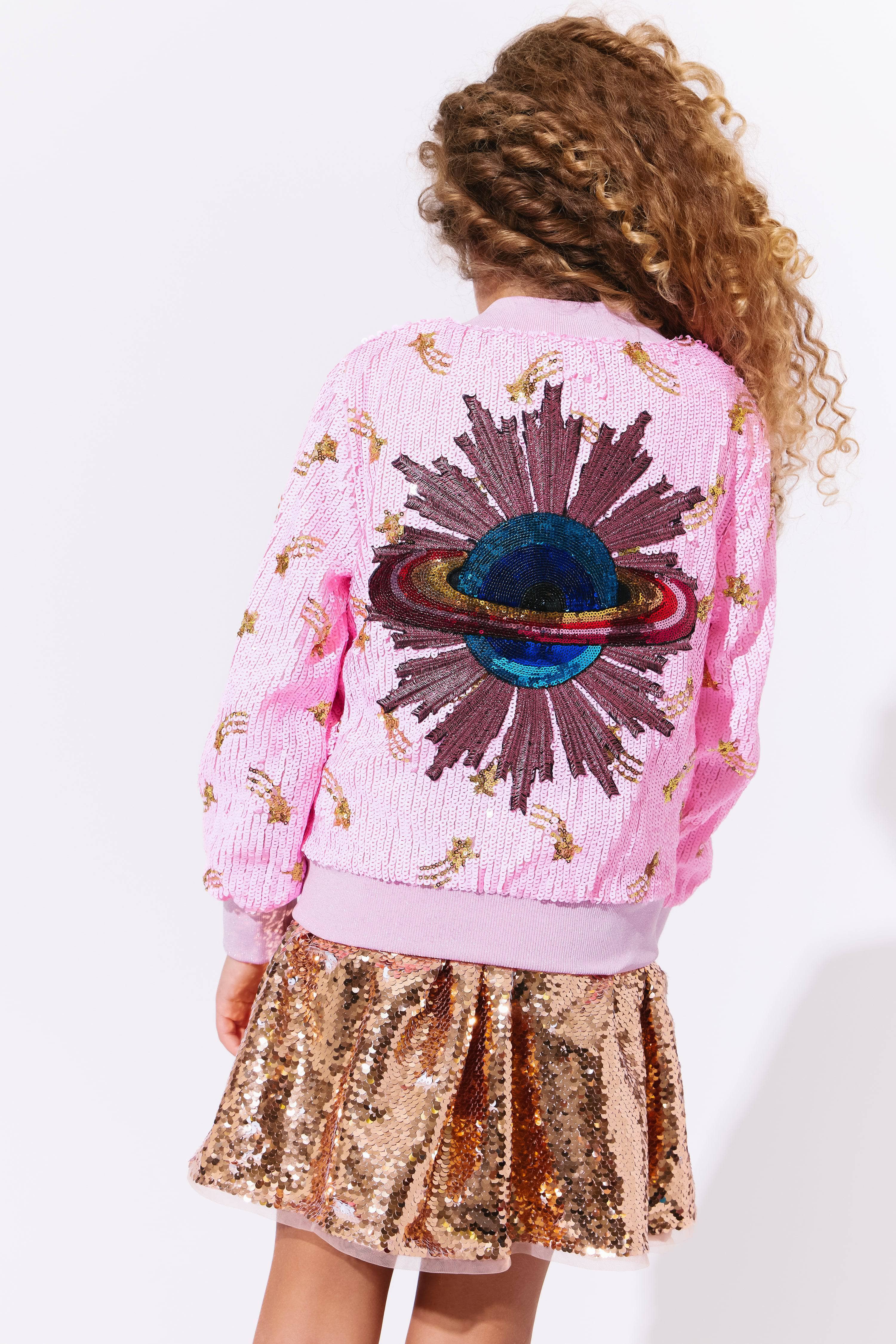 - Stunning pink bomber jacket covered in gold and silver shooting star sequins for a dazzling cosmic look.