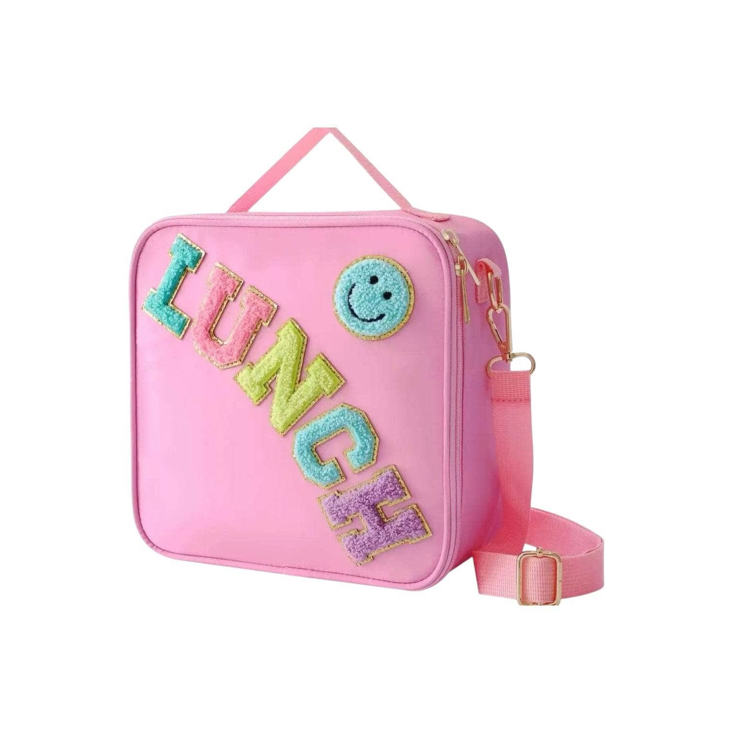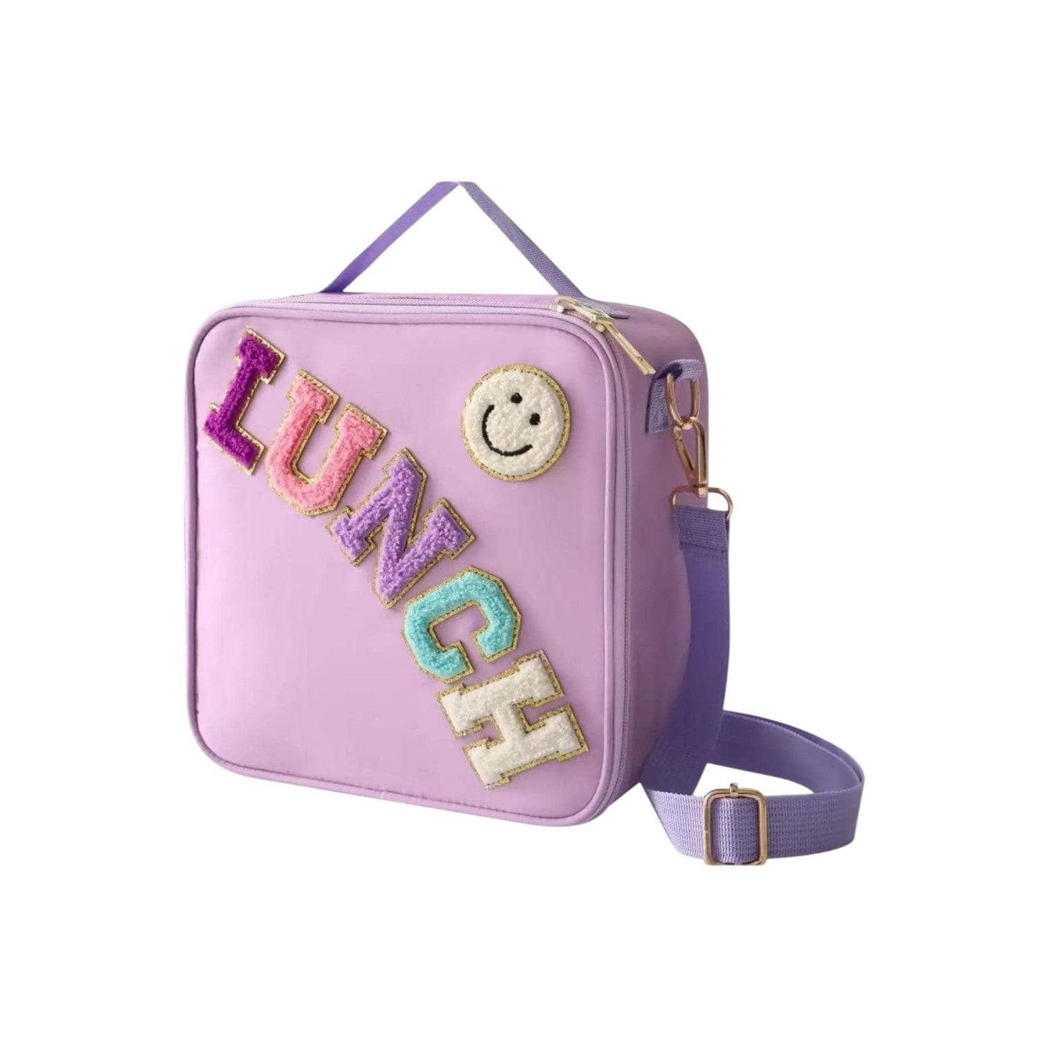 - Stylish and vibrant lunch bag with colorful "LUNCH" patch lettering and smiley face embellishment.