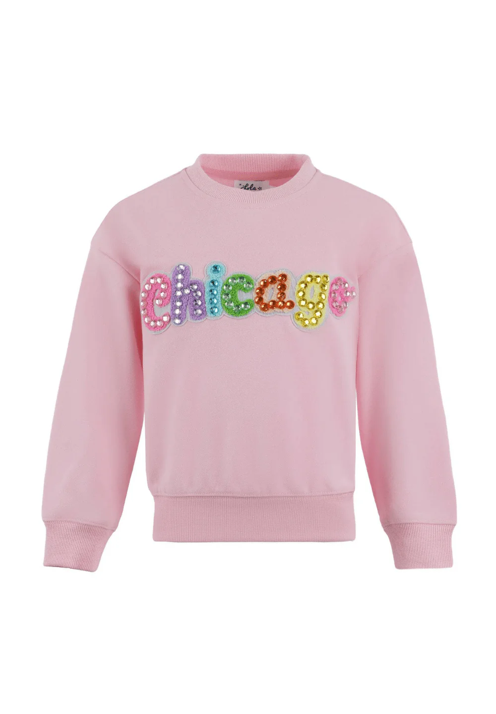 - Features a sequin rainbow “Chicago” patch in playful multicolor letters across the chest