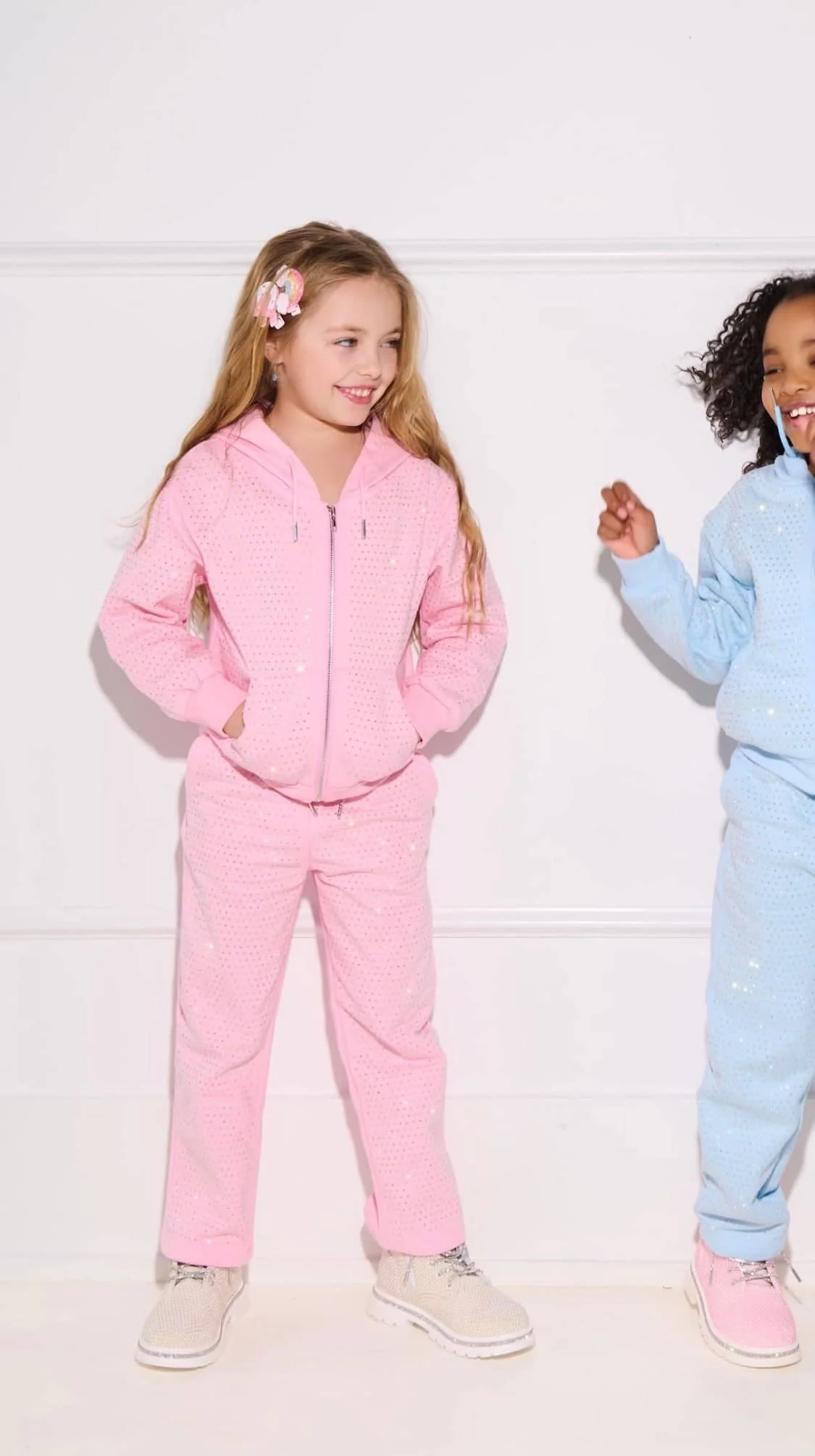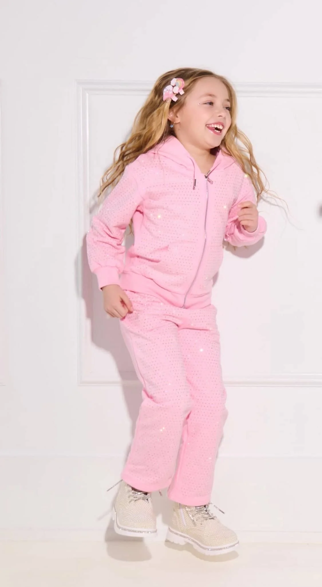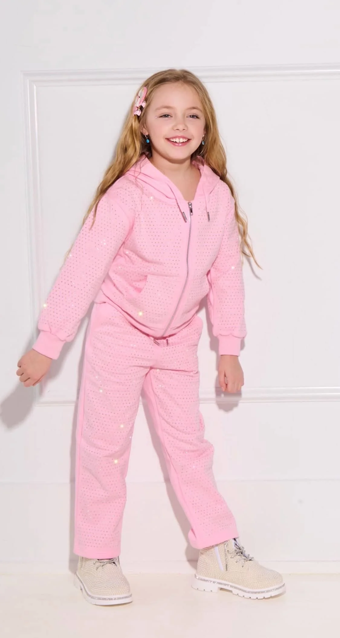 - Soft pink hoodie with zip-up closure and flared pants for a relaxed yet stylish fit.