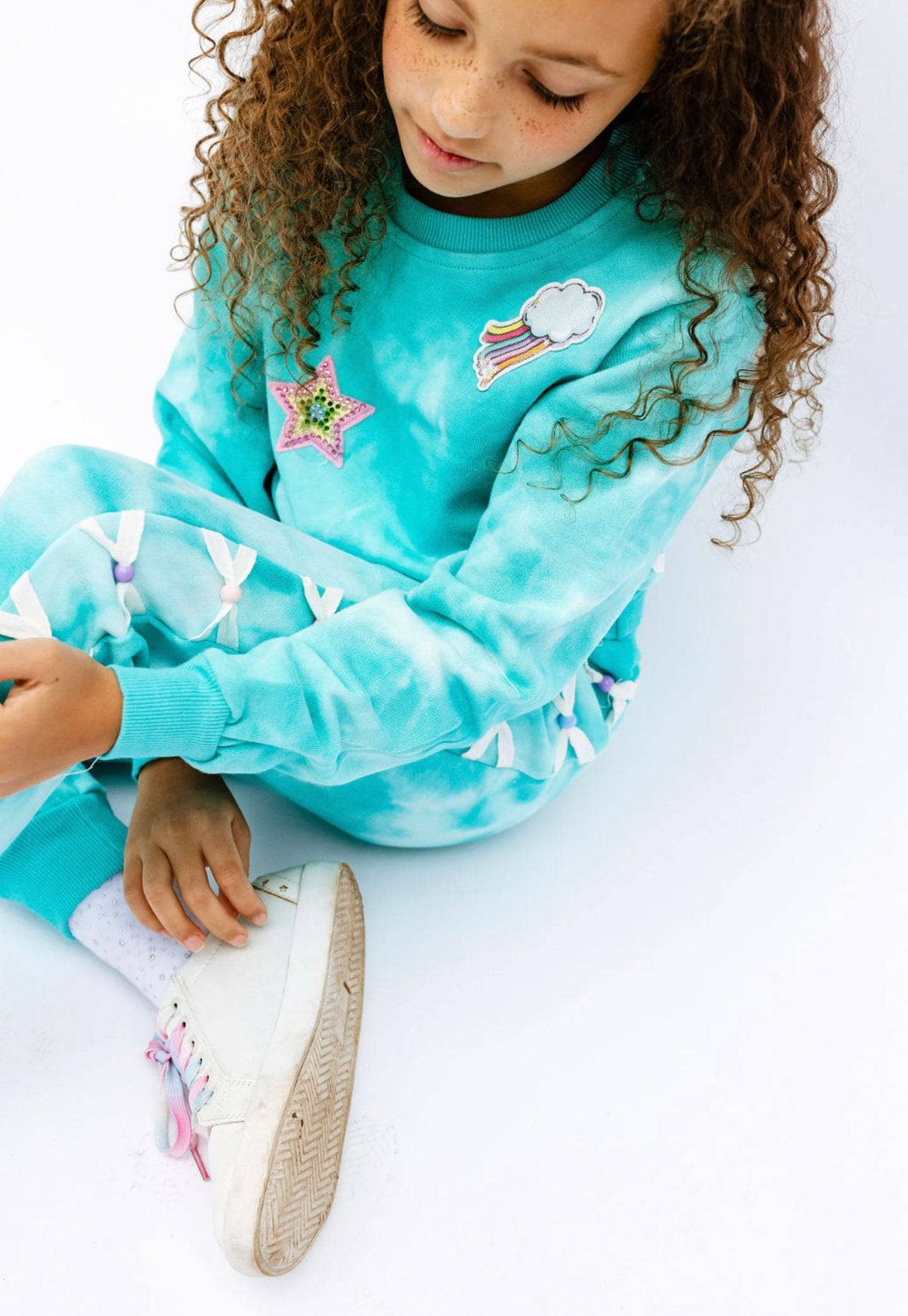 - Features cropped sweatshirt with colorful patch details—stars, rainbows, and clouds.