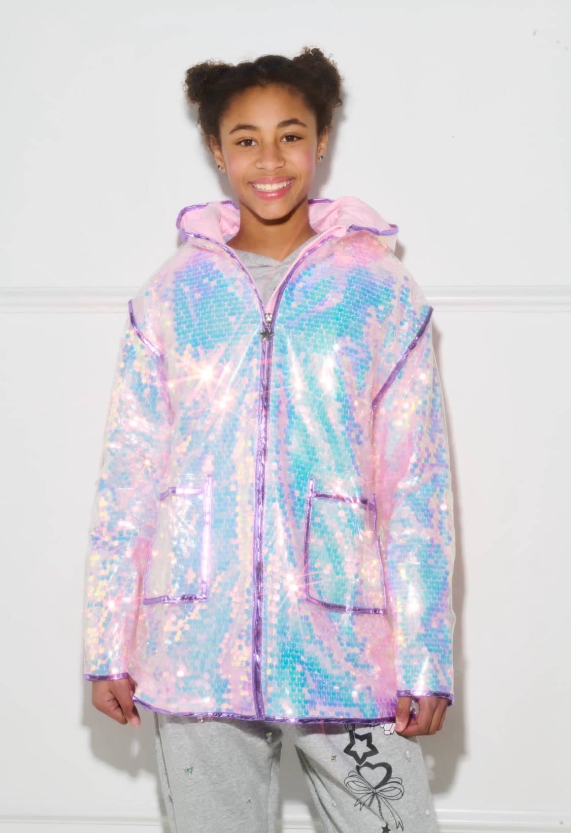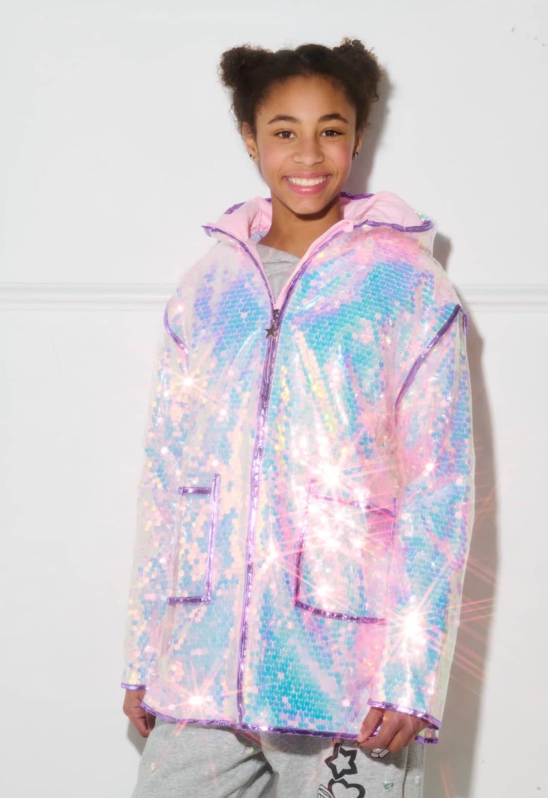 - Dazzling iridescent sequin rain jacket that sparkles with every move.