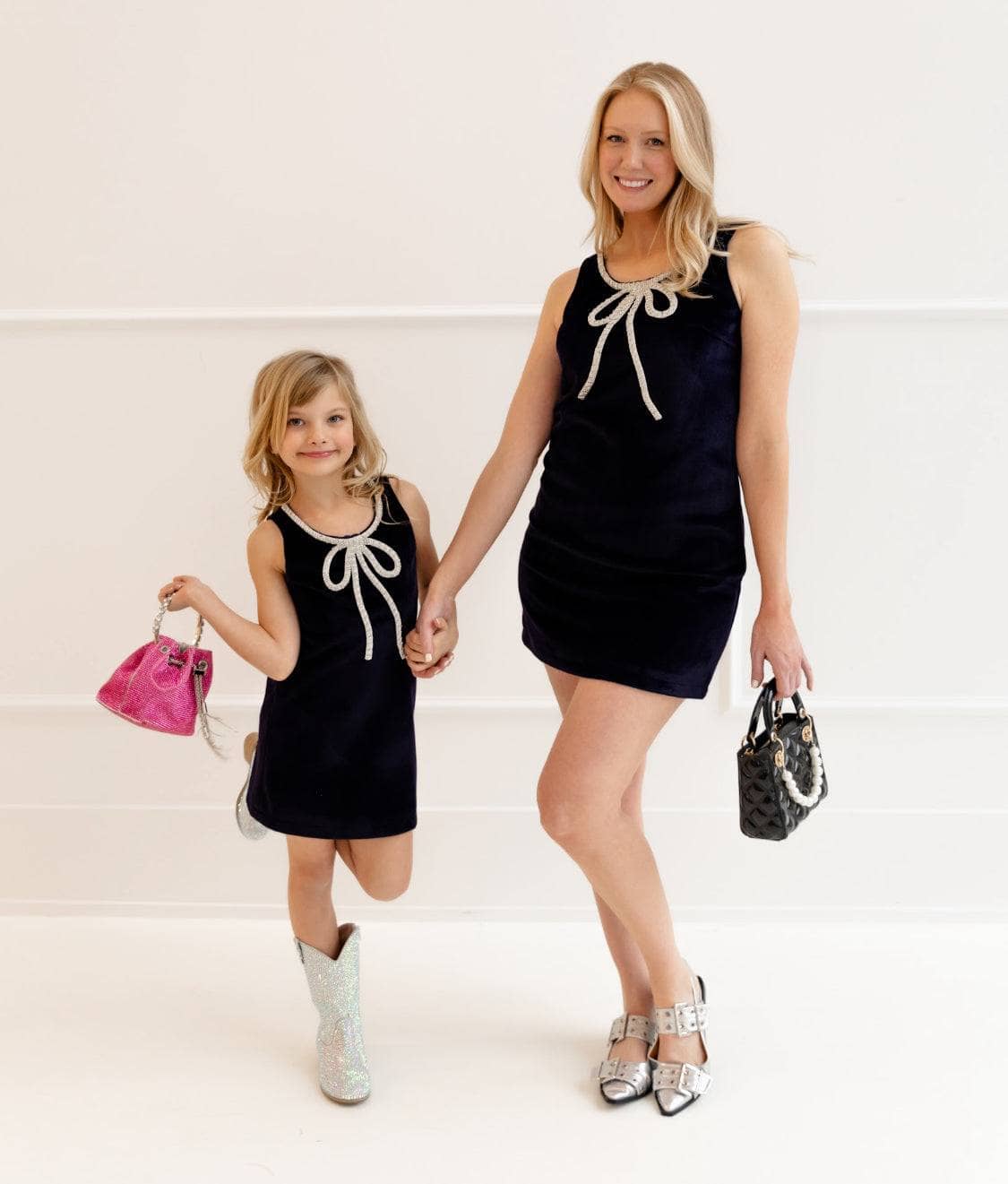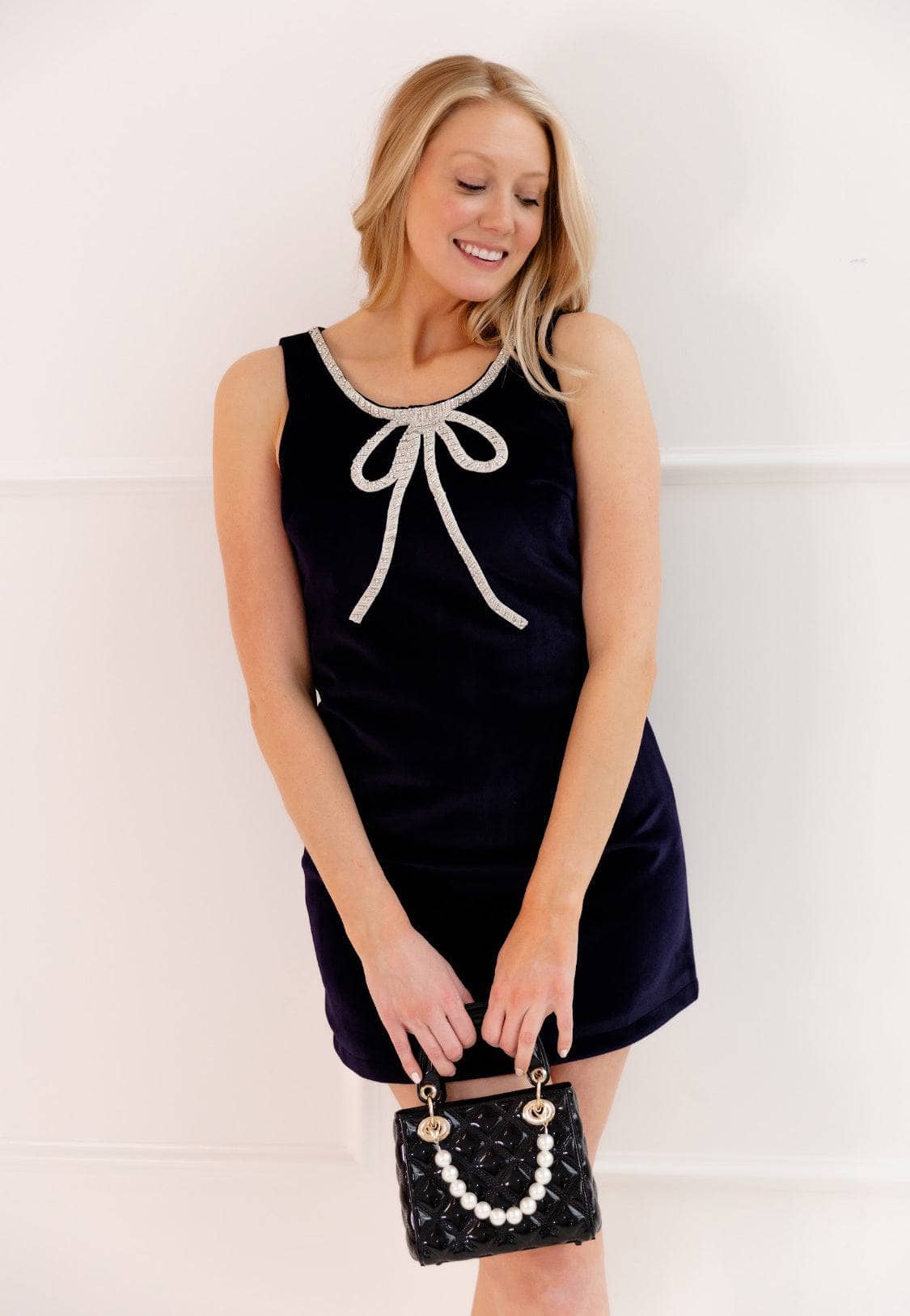 - Elegant Navy velvet dress featuring a stunning rhinestone bow detail at the neckline for a regal touch.